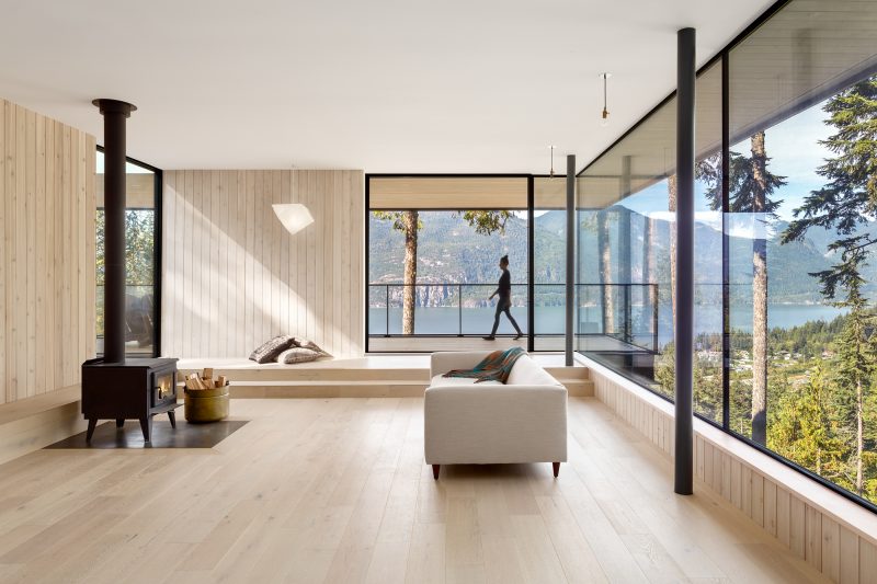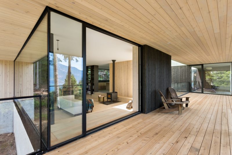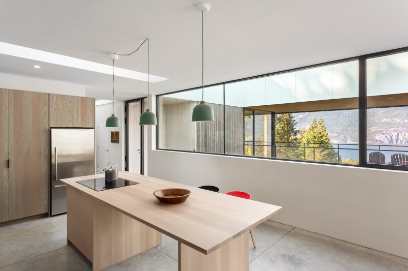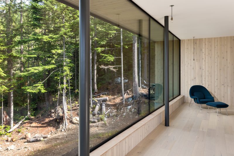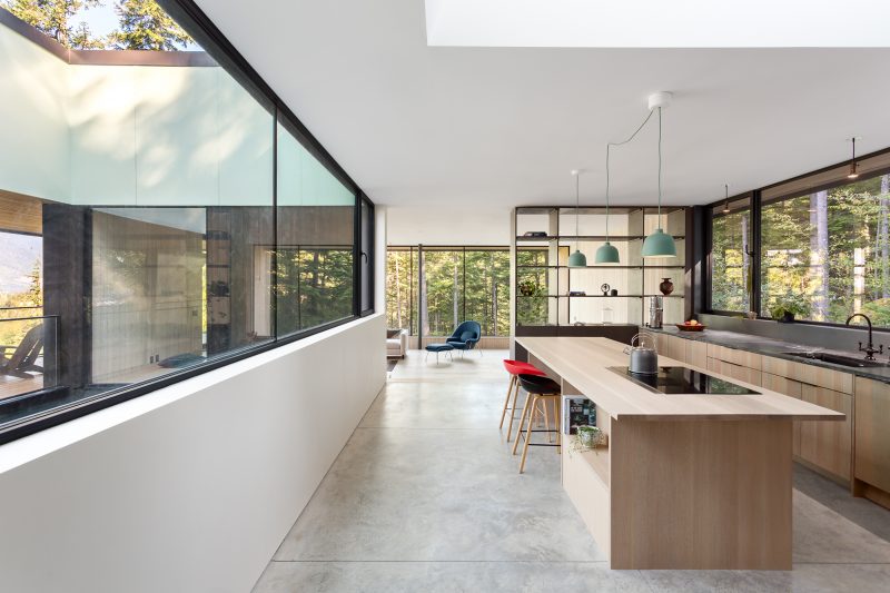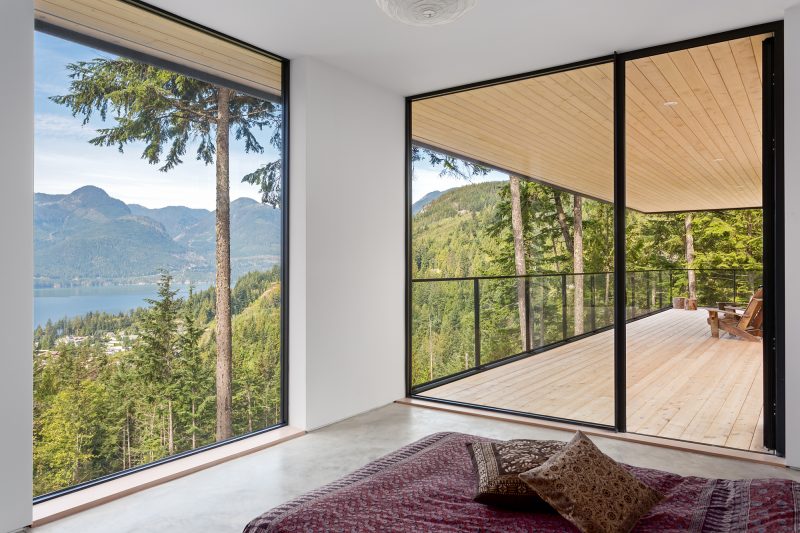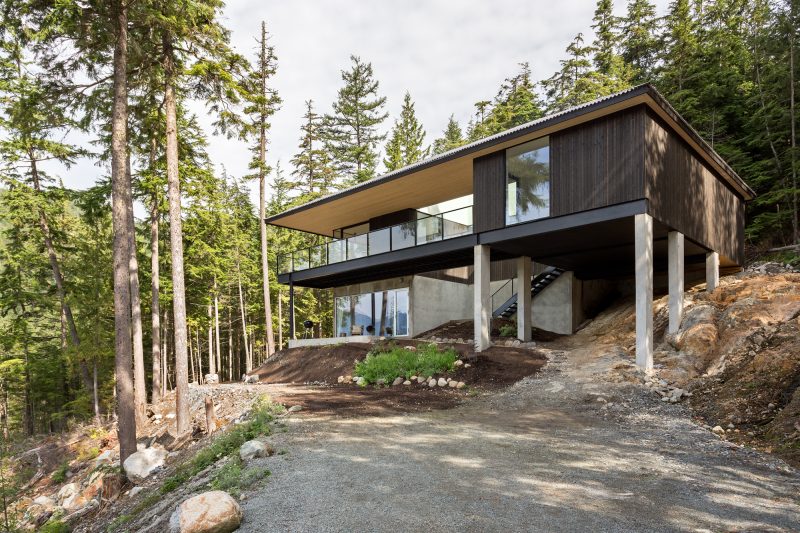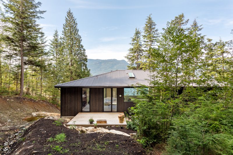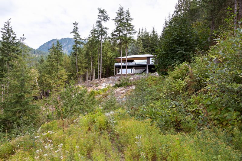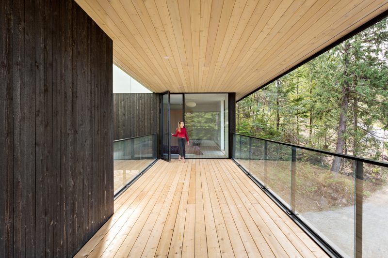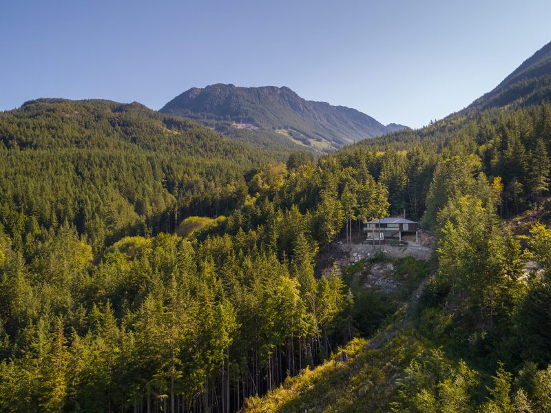 The unique design for this house stemmed from the clients’ proposed guidelines from Vastu – a traditional Hindu system of architectural organization. It required the main axis of the house to be aligned along the N-S axis and orient each space towards the central open courtyard. The 1800 square foot house is elevated above the granite bedrock below to allow flood waters from the adjacent creek to overflow underneath the house. Living spaces are elevated above the forest floor and provide treehouse like views of Mineral Creek to the North and Howe Sound’s Defence islands to the South. 3” corrugated steel roofing, black stained cedar siding and expansive triple pane bronze glazing units configure around a colourfully painted courtyard.