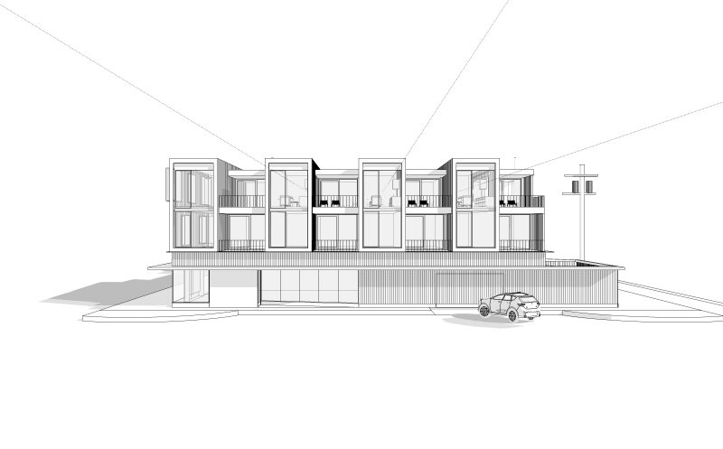An infill development on a vacant corner site in downtown Squamish, with commercial units at grade and walk up rental units above.