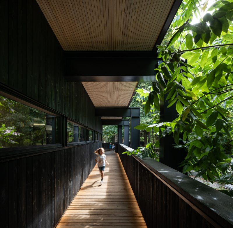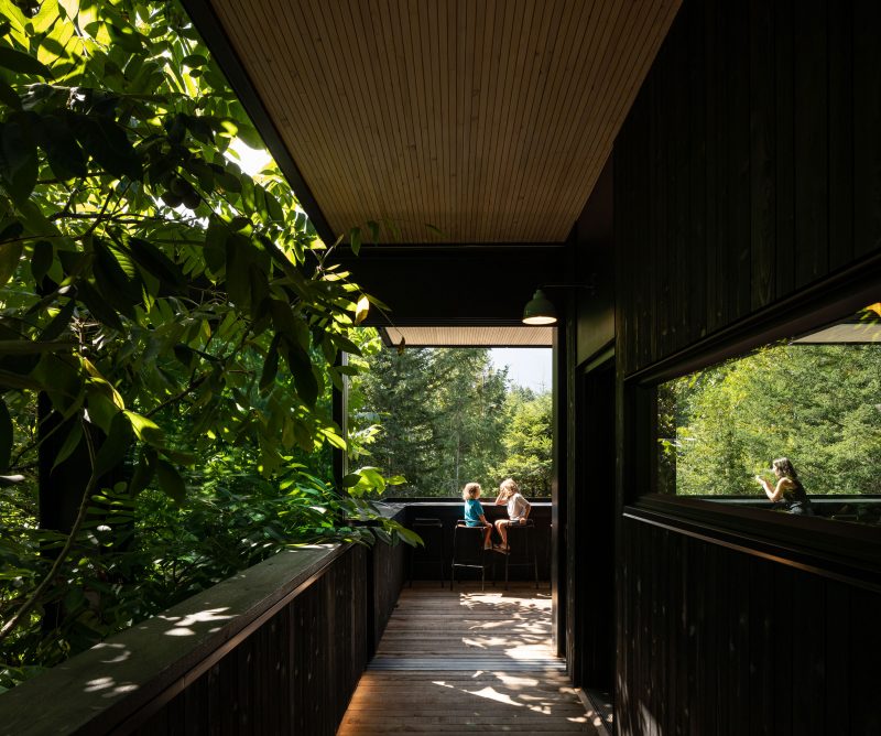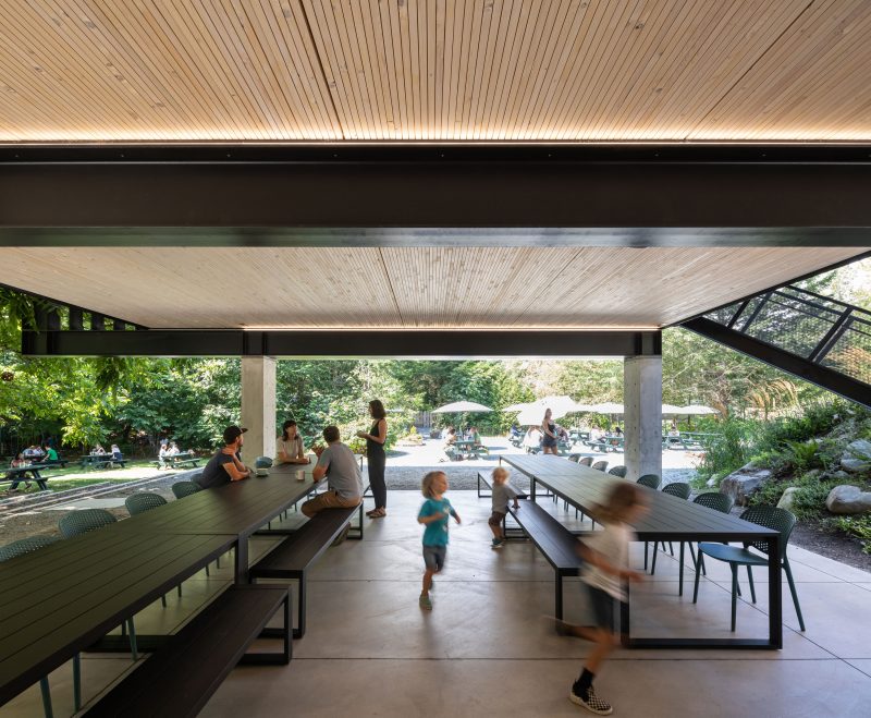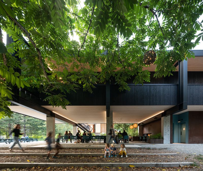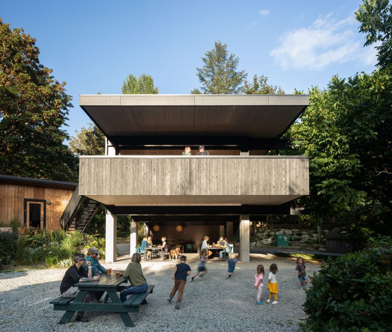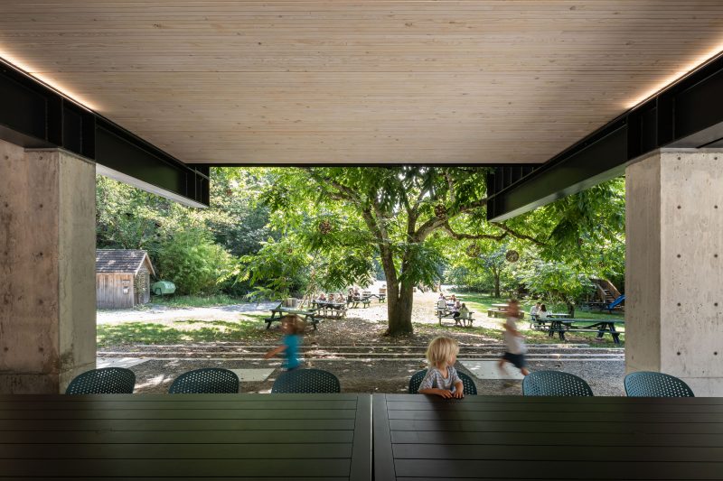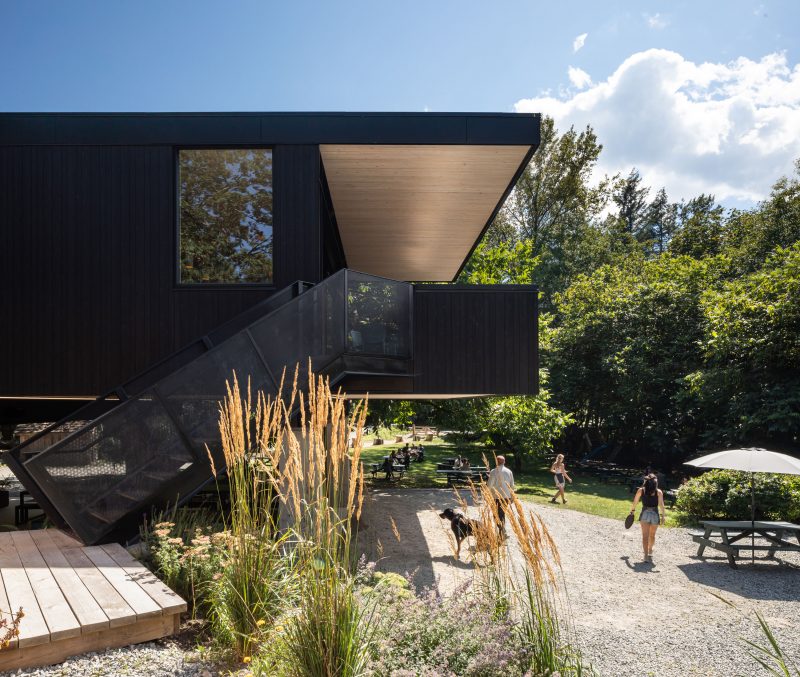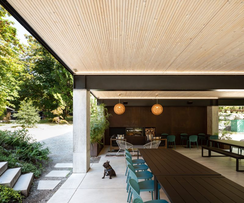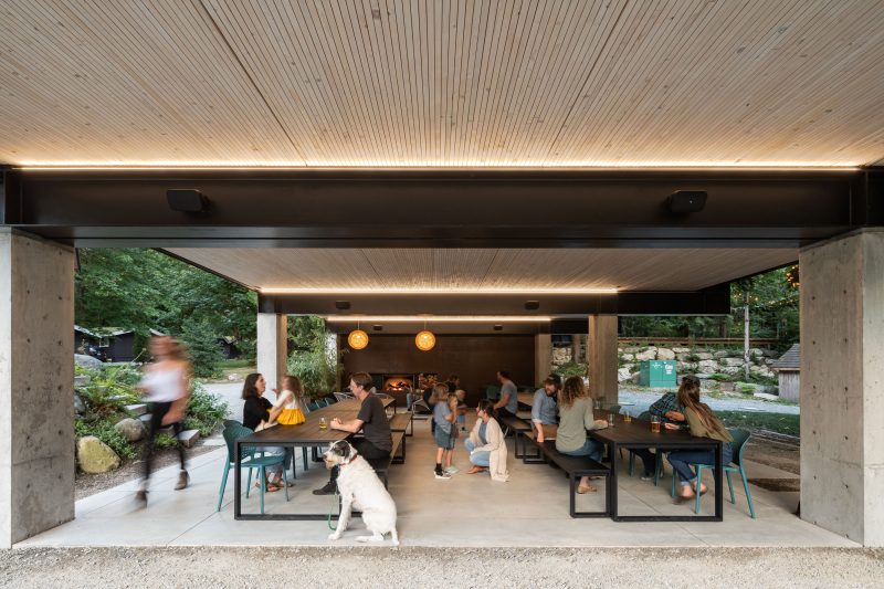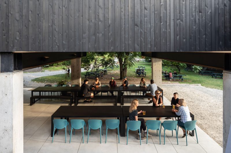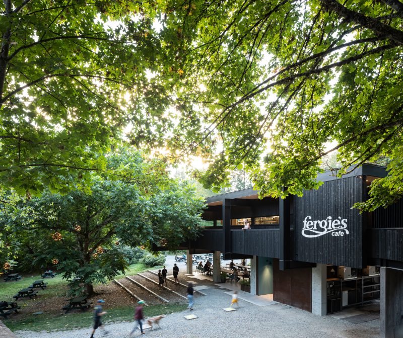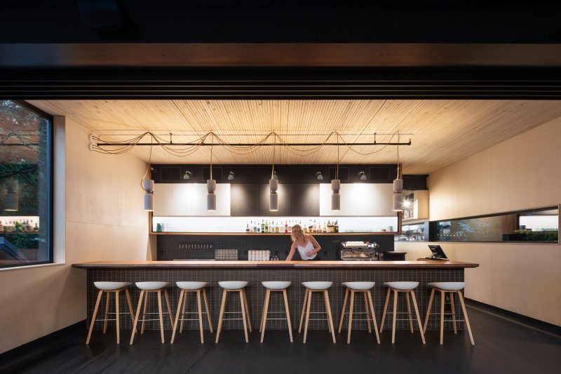 After a fire burned down the original cafe, the owners approached hunterOFFICE to redesign a more ambitious, sustainably designed and functional restaurant. Working within the incredibly challenging flood, seismic and geo-technical constraints of the site, an elevated dowel laminated timber structure was designed. The minimalist cedar clad modern kitchen and bar above hovers above the covered picnic seating beneath and nestles into the much loved 100 year old walnut tree. Framed views of Alpha mountain and the river to the North, guided the orientation of the 10′ cantilevered patio.