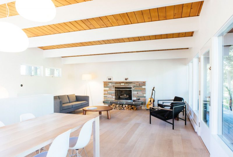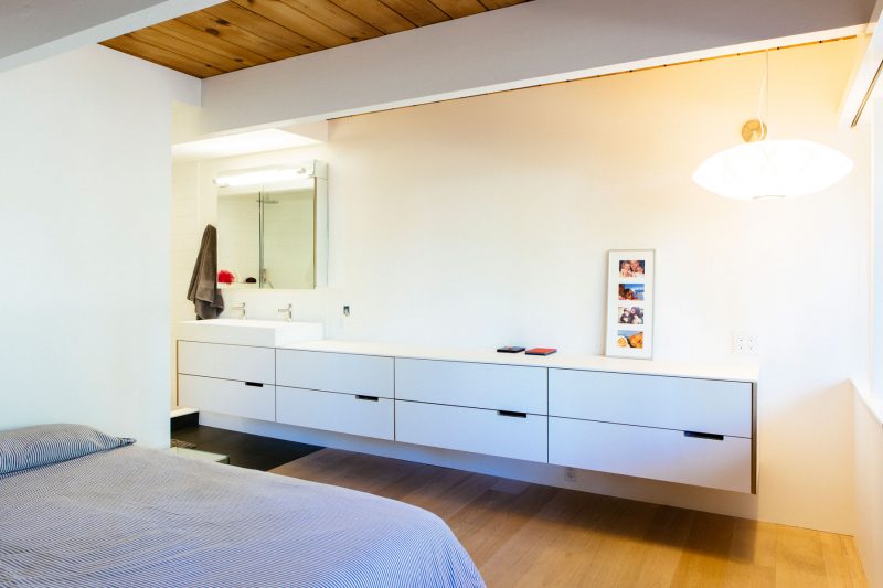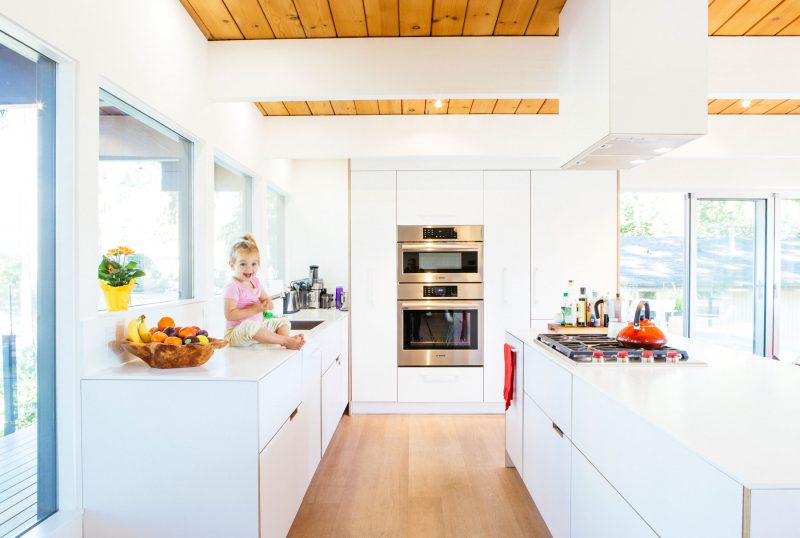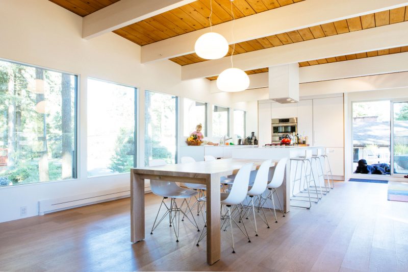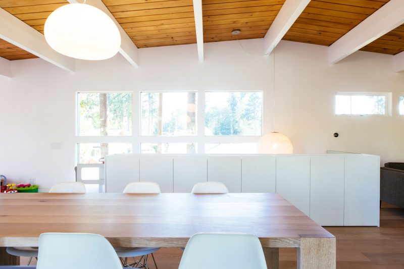 A major renovation of an owner built mid-century post and beam house in North Vancouver. The house already had great proportions, generous glazing and light but lacked practical updates needed for a modern and growing family. All aspects of the house were stripped down to the studs and re-worked to provide a durable, light filled and functional house. White oak, formica facade plywood, white-washed fir and black paint made up the minimal but cozy material palette.