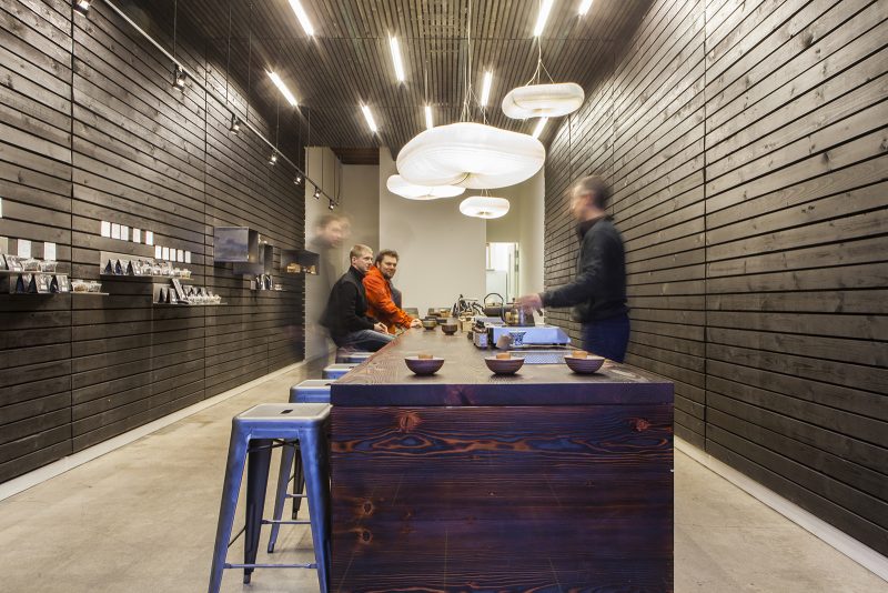 O5 is a passionately owned tea company, who’s beautifully restrained branding by Talia Cohen inspired the minimalist design. hunterOFFICE’s design strategy reinforced the owner’s calm ethos and the purity of the products. Black stained cedar slats wrap the interior volume and act as an armature for the steel shelving and frame the 28′-0″ charred fir island, crafted by Christian Woo. The space encourages interaction and participation from both sides of the island and is frequently utilized for excessive dinners, chef’s private tastings, and infamous mezcal sampler nights.